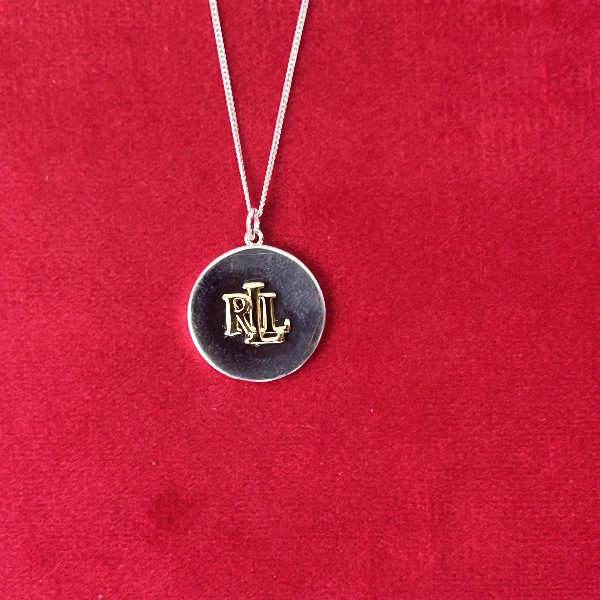 The Lauren Ralph Lauren pendant necklace is delicately crafted from sterling silver, featuring a round pendant with a gold-plated RLL logo suspended on a belcher chain. The chain measures 40cm in length.